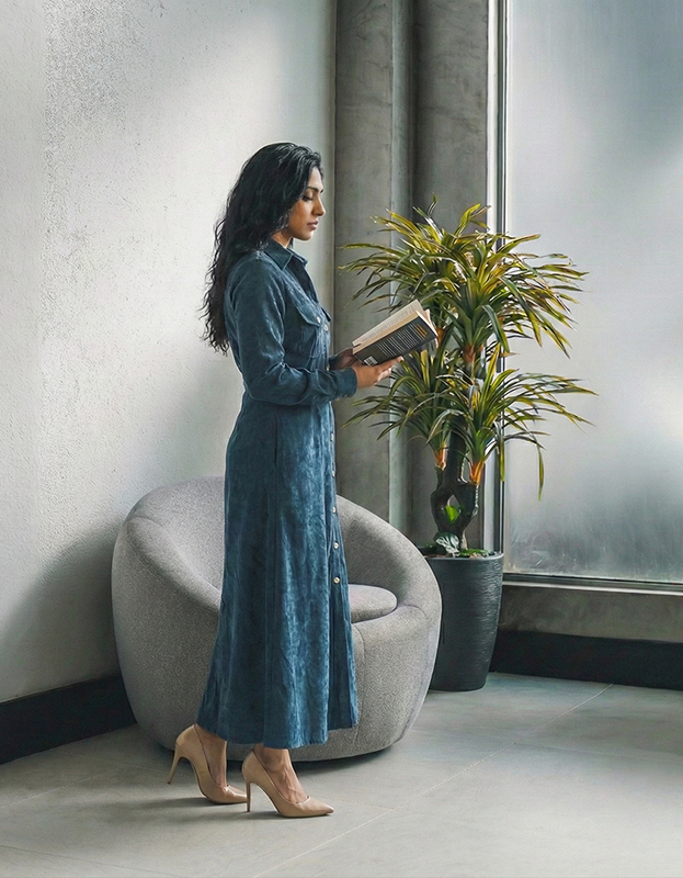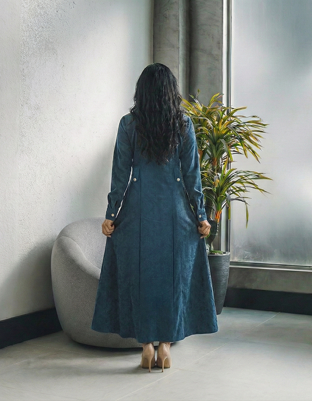The design is elevated with elegant golden buttons that add a touch of refinement and classic charm. A thoughtfully placed top pocket and discreet side pockets enhance functionality, making the dress both stylish and practical for travel and long days on the move.